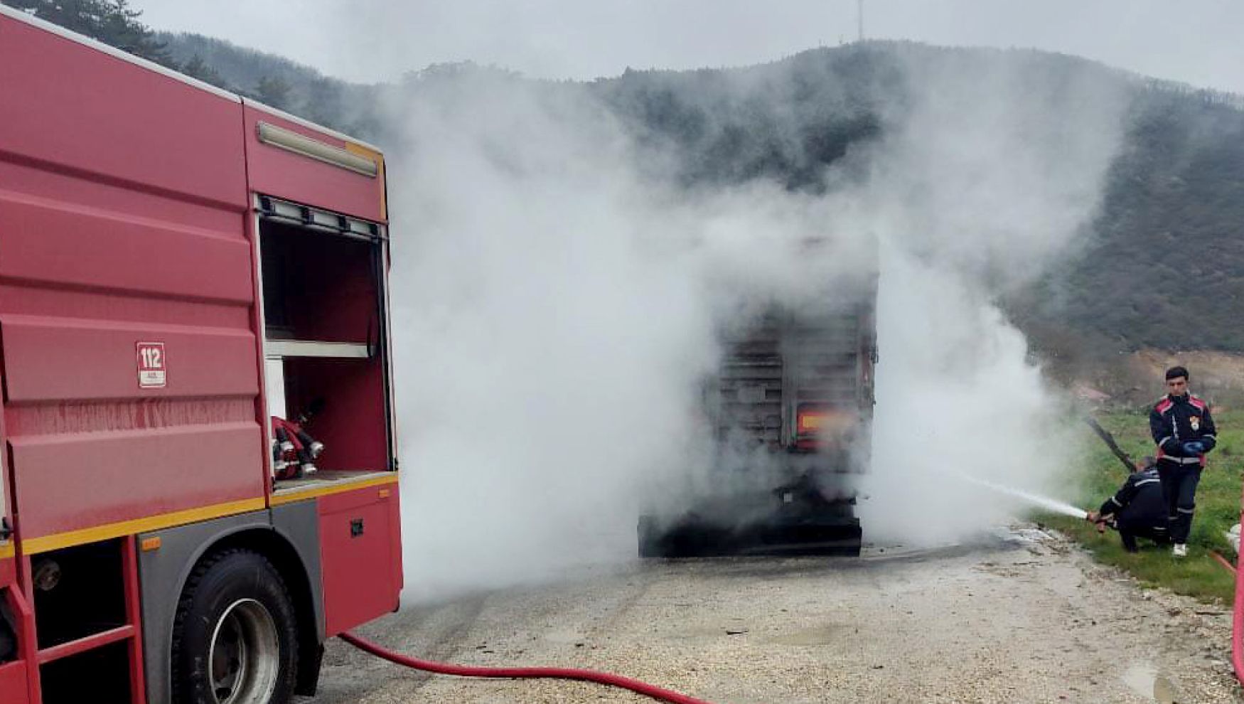 Olay, Taşkesti-Mudurnu karayolunun Tosunlar köyü mevkiinde meydana geldi. Edinilen bilgilere göre, 59 KJ 008 plakalı tırın sürücüsü arka lastikten yükselen dumanı fark ederek aracı yol kenarına çekti.